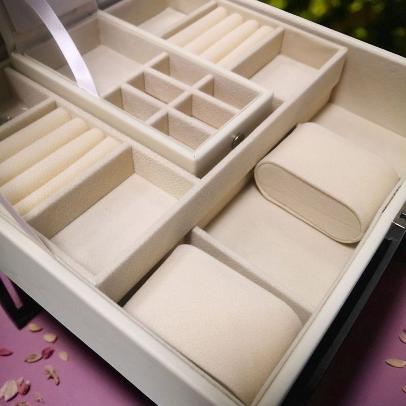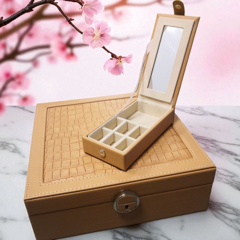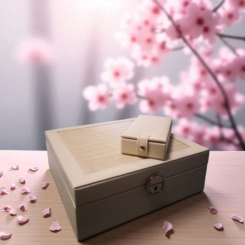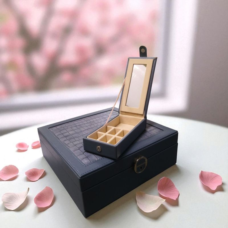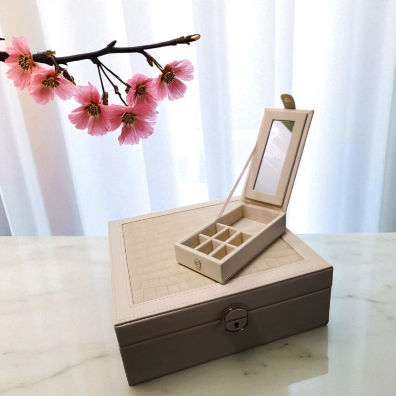 Кутия за бижута, която е нежна и елегантна, но същевременно практично решение за подредба на любимите бижута. Серията от кутии КОМФОРТ И СТИЛ с отличаващи се форма и цветовете са подбрани така, че да задоволят всеки изтънчен вкус, който търси удобство и практично решение за съхранение на накити и дребни любими предмети.Голямата кутия съдържа и по-малка в себе си, която да използвате за съхранение на бижута при пътуване или в дамската чанта.Посочената цена е за един комплект от голяма и малка кутия, като може да  изберете предпочитания цвят от менюто с варианти.