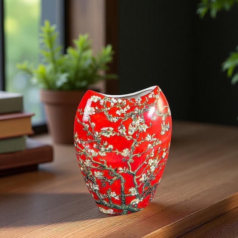 ПОРЦЕЛАНОВА ВАЗА ПО КАРТИНА НА ВАН ГОГ - ЦЪФНАЛИ БАДЕМИ / червен фон /