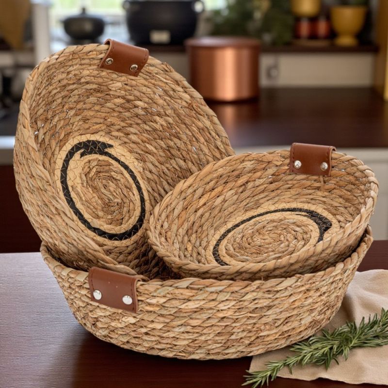 Красив комплект от 3 броя различни по големина панери, които да бадат практично допълнение към нуждите на дома. Изработени изцяло от естествени влакна, те могат да бъдат и природосъобразен начин за използване в ежедневието. Акцентите от дръжки и друг цвят са съчетани така че артикула да изглежда само още по-красив.