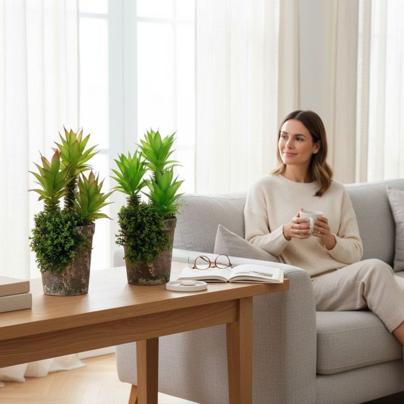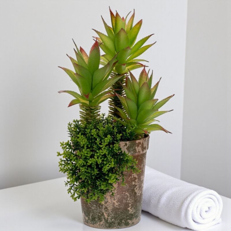 Керамична кашпа със състарена визия е приютила растение, което с вида си ще ви заблуди , че е истинско.Подходяща за аранжиране на тъмни пространства ,както и за помещения в които не се полага грижа за живи растения, тази изкуствена аранжировка от растения ще придаде нова визия и ще добави цвят.