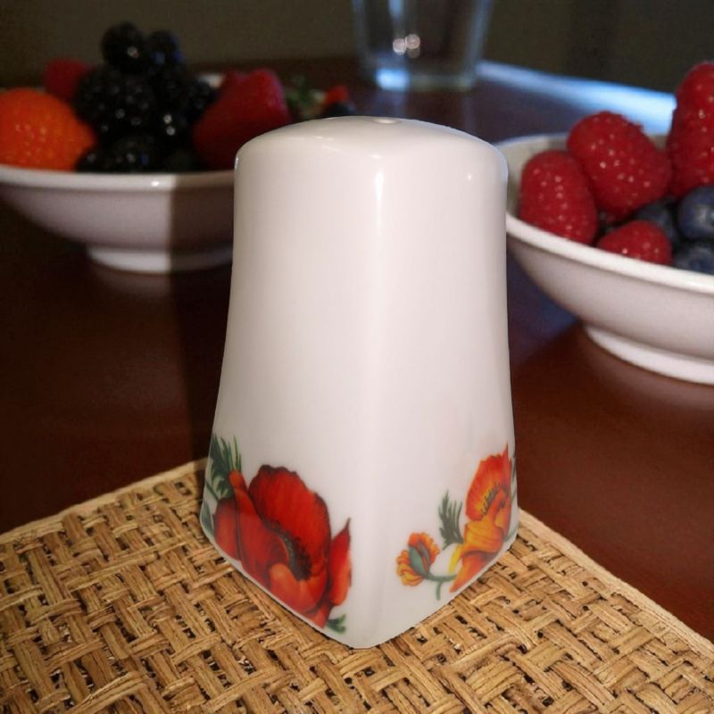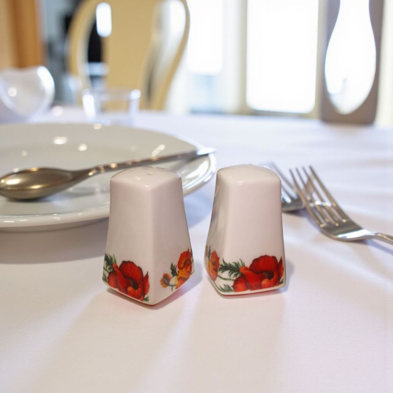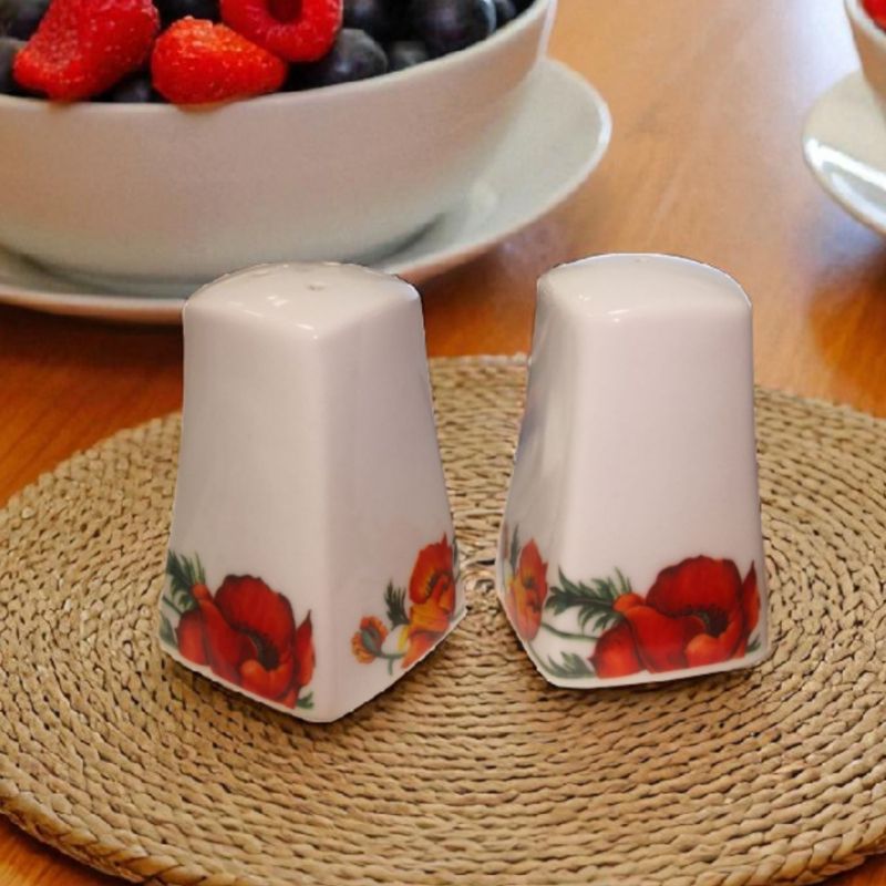 Красив комплект от солничка и пиперница с декор на червени и оранжеви макове. Практично допълнение към всяка трапеза и акцент към декорацията на масата.
