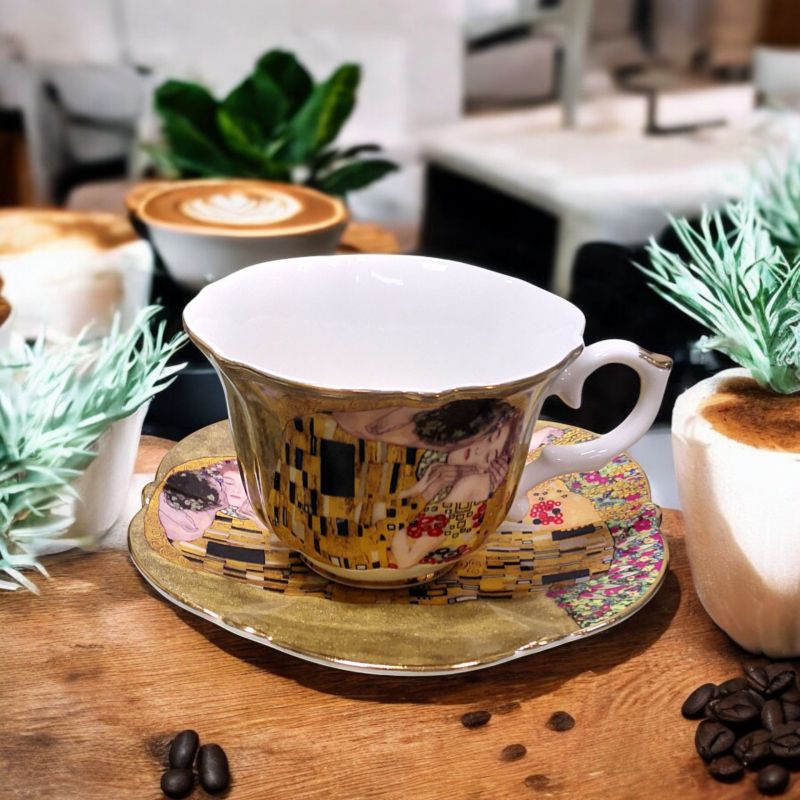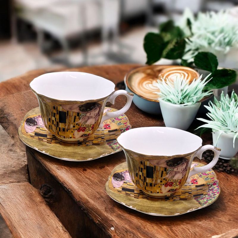 Когато изкуството влиза в ежедневието ни с красиви предмети, то оживява и ни пренася в света на творците.Една от най-известните картини ЦЕЛУВКАТА на Густав Климт е доказателство за това.Подбора на предмети в серията е направен така, че всеки да открие своя артикул.Насладете се на любимите напитки и нека удоволствието от тях се удвои.Предлага се в подаръчна кутия с красив принт на капака. Комплектът от серията ЦЕЛУВКАТА съдържа 2 броя чаши, 2 броя чинийки.