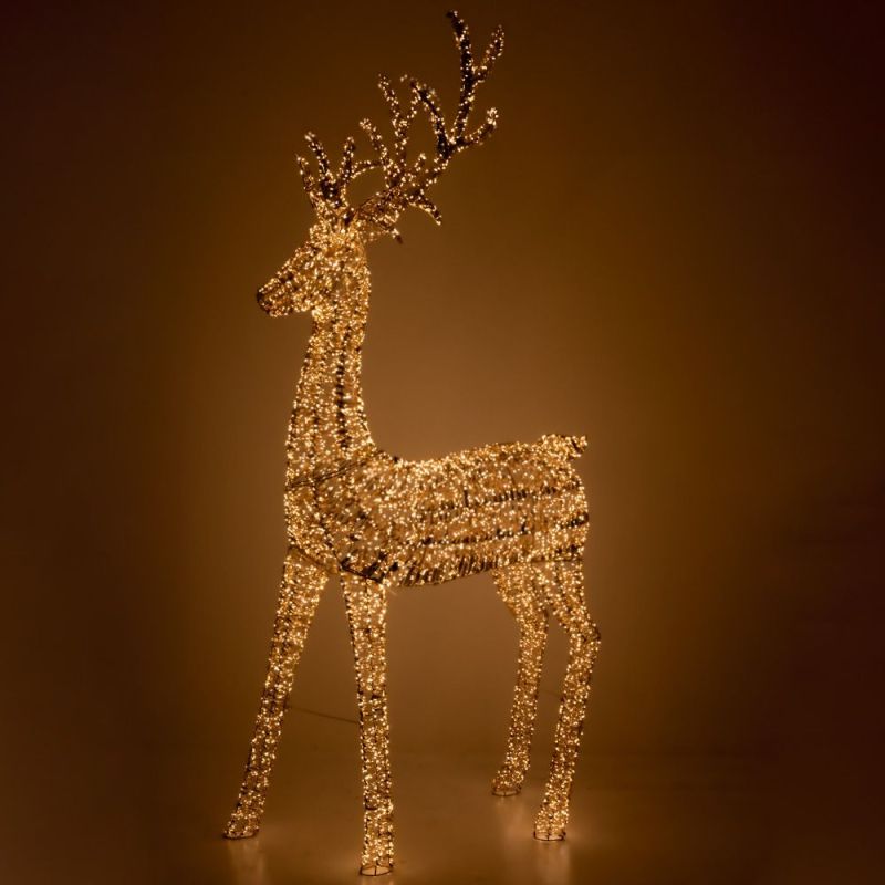 Светеща голяма декорация с визия, която променя пространства и създава стил, който се помни. Златистият цвят допринася за вида на изделието, което създава усещането за вълшебство от приказките. Вградените малки 5200 лед-лампички светят, като малки светулки и обгъщат елена във светлинки придавайки му обем и изпълвайки екстериора с настроение за истински празник.