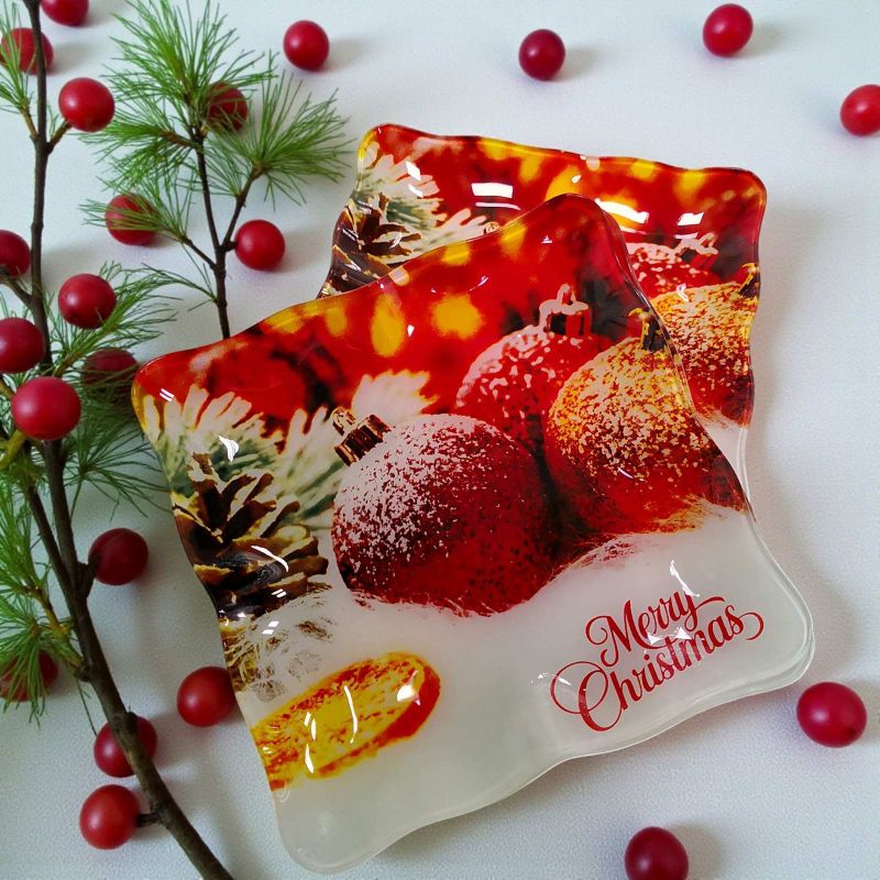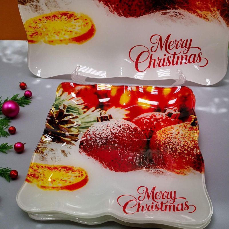 СТЪКЛЕН КОЛЕДЕН КОМПЛЕКТ ЗА ТОРТА 7части - ЗАСКРЕЖЕНИ ТОПКИ В СНЕГА