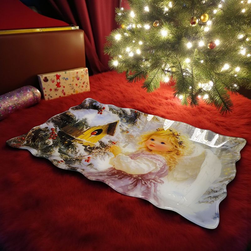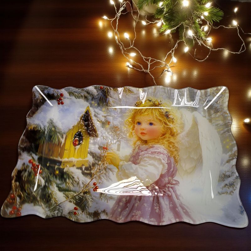СТЪКЛЕНО КОЛЕДНО ПЛАТО 35см*23см - УСМИВКИ НА ДЕТЕ И ПТИЧЕ