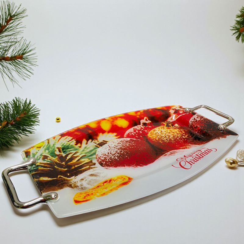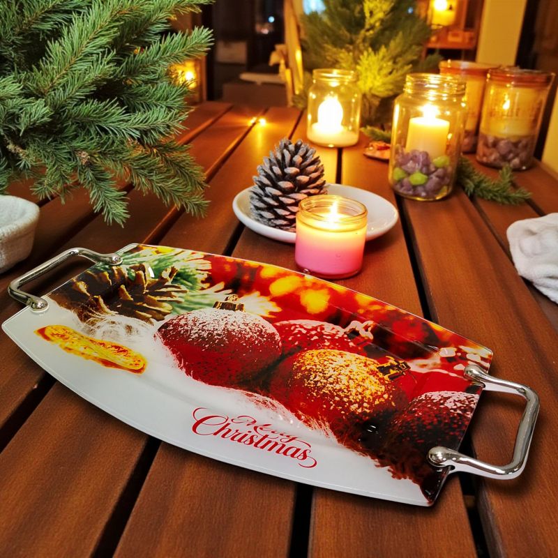 СТЪКЛЕН КОЛЕДЕН ПОДНОС С ДРЪЖКИ 48см*25,5см - ЗАСКРЕЖЕНИ ТОПКИ В СНЕГА