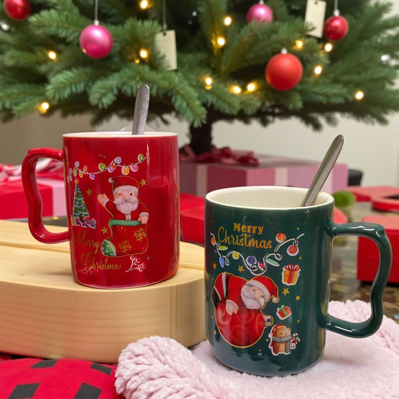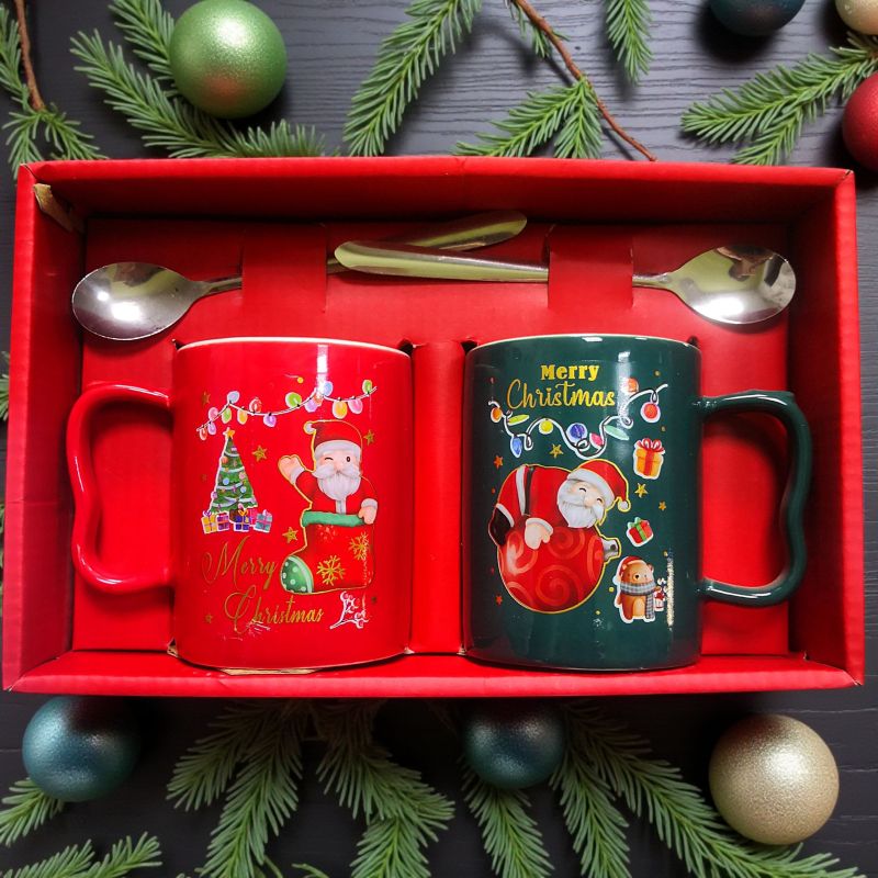 Подаръчен комплект от 2 броя чаши в различни цветове, цветовете на Коледа допълнени с лъжички и опаковани в красива кутия . Подходящи за подарък или просто допълнение към атмосферата на празника.