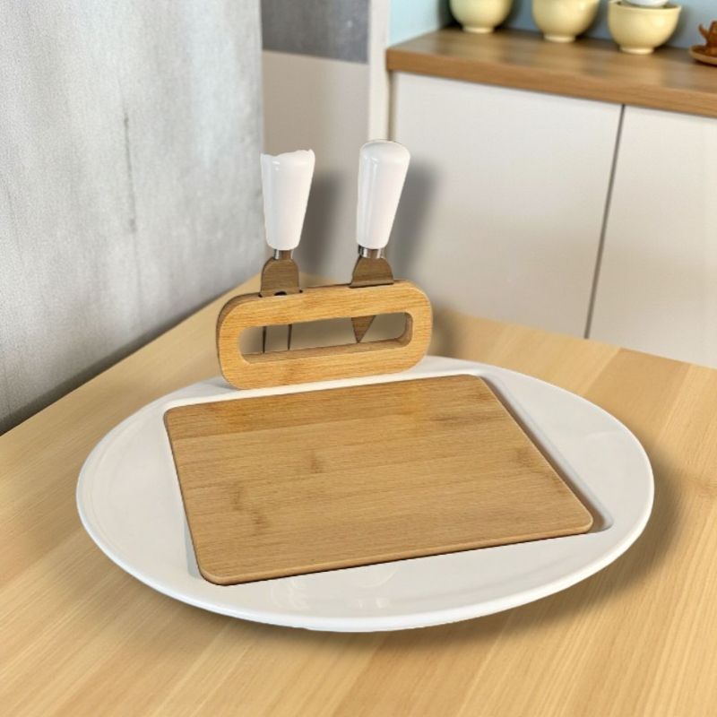 Артикулите от серия ВКУСЪТ НА ДОМА са красиви, но преди всичко практични за употреба. Те са удобни за ежедневието ви, като използването им ще се превърне в ритуал на удоволствието. Всички изделия са направени от качествени материали, а елементите от бамбук подчертават естествените материали при производството им. Този комплект от плато и ножчета за сирена е чудесен начин да допълните вкусовете на трапезата и всеки да открие своя. Дъската е допълнение за удобство, а поставката за ножовете ще подреди трапезата по най-добрия начин.