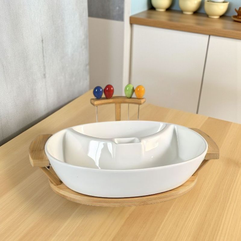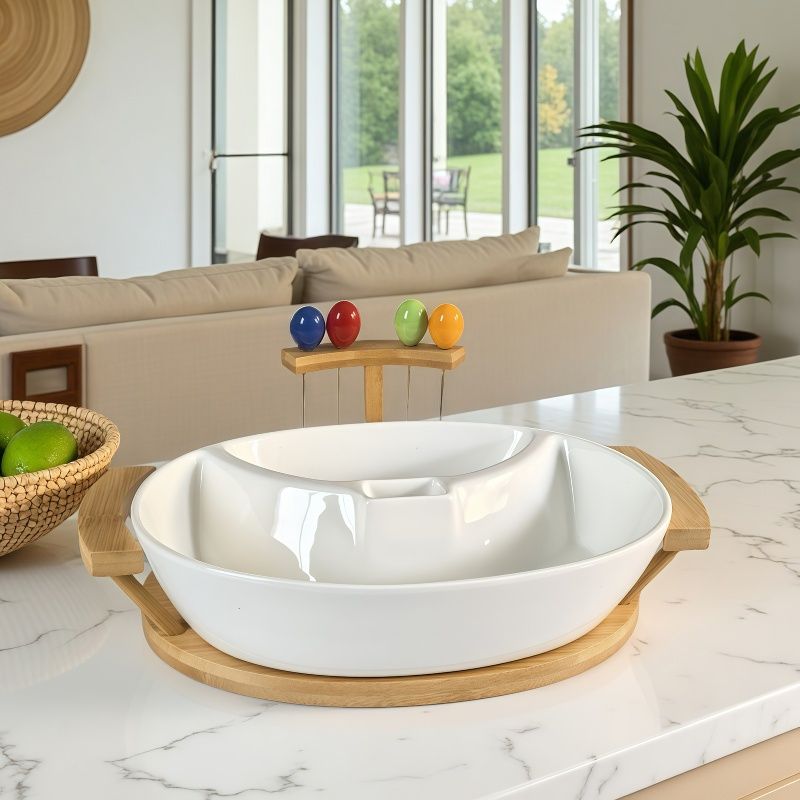 Артикулите от серия ВКУСЪТ НА ДОМА са красиви, но преди всичко практични за употреба. Те са удобни за ежедневието ви, като използването им ще се превърне в ритуал на удоволствието. Всички изделия са направени от качествени материали, а елементите от бамбук подчертават естествените материали при производството им. Този ордьовър е чудесен начин да допълните вкусовете на трапезата и всеки да открие своя. Виличките са допълнение за удобство, а порцелана с качеството си ще изпъкне на трапезата по най-добрия начин.