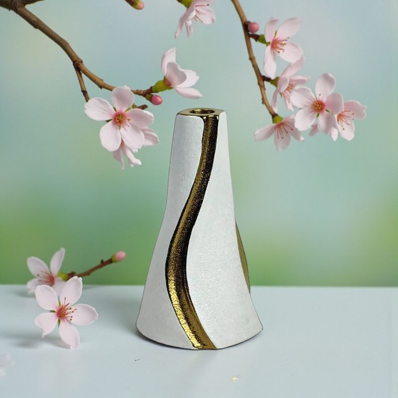 Артикулите от серия ИЗКУСТВО В БЯЛО И ЗЛАТО със стилното преплитане на класическото бяло и златно са изделия от онази класа, която винаги се забелязва и е повод за възхищение. Предмети, които се вписват в интериорите и ги променят със стил, който говори за изискан вкус. Комбинирайки различни артикули от серията вие може да направите ансамбъл от красиви предмети, с които да запълните пространство у дома и да му вдъхнете нов живот. Този свещник за конусна свещ е нестандартен начин да докажете, че предназначението на предмета не може да бъде променяно от формата му.