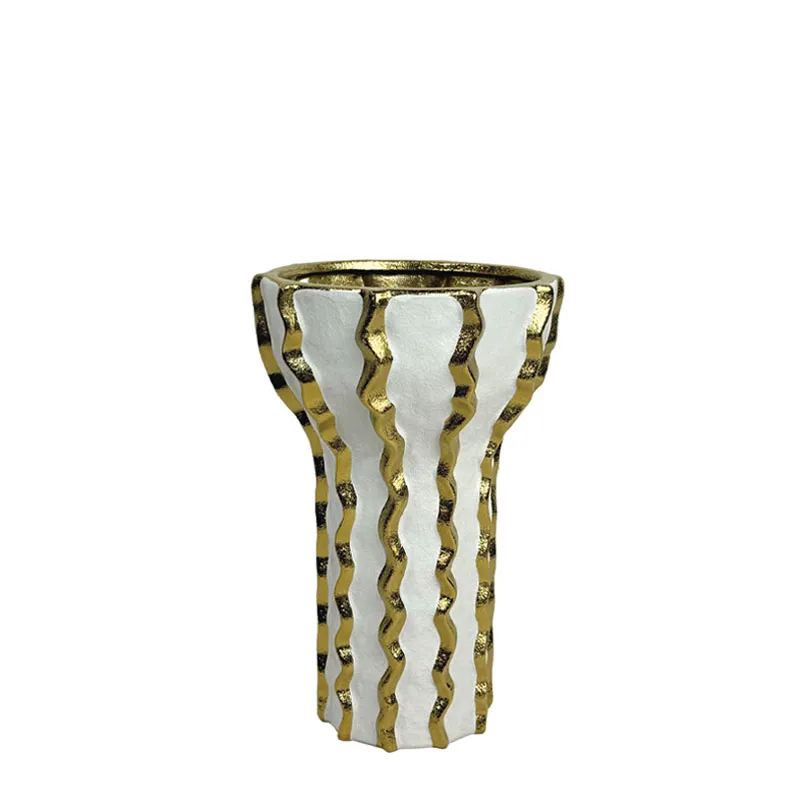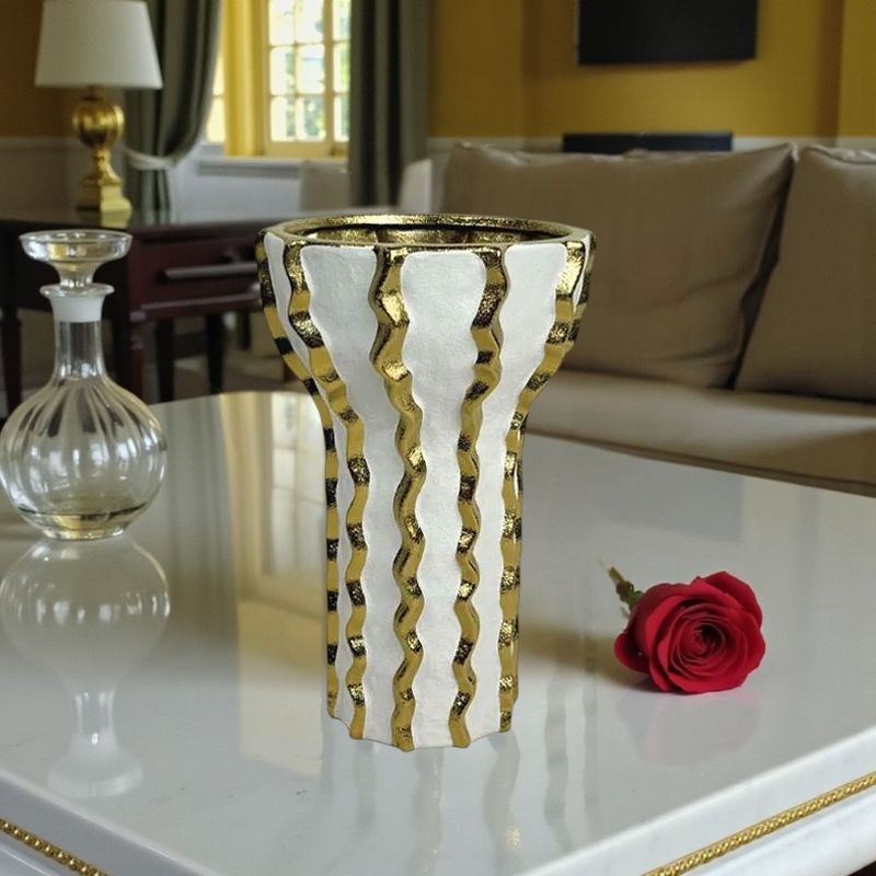 Купите и вазите от серия ЗЛАТНИ ПЪТЕКИ КЪМ ЩАСТИЕТО са чудесна комбинация от класически цветове, които са доказали непреходността във времето. Златната шарка наподобява криволичеща пътека, символ на пътят в живота и стремежът на човек към новото. Подходящи комбинации могат да бъдат направени с артикулите, така че да запълнят пространства, като им вдъхнат нов живот. Изделията могат да се използват с вода.