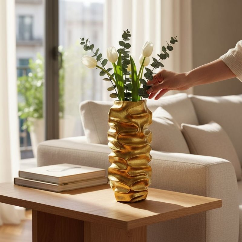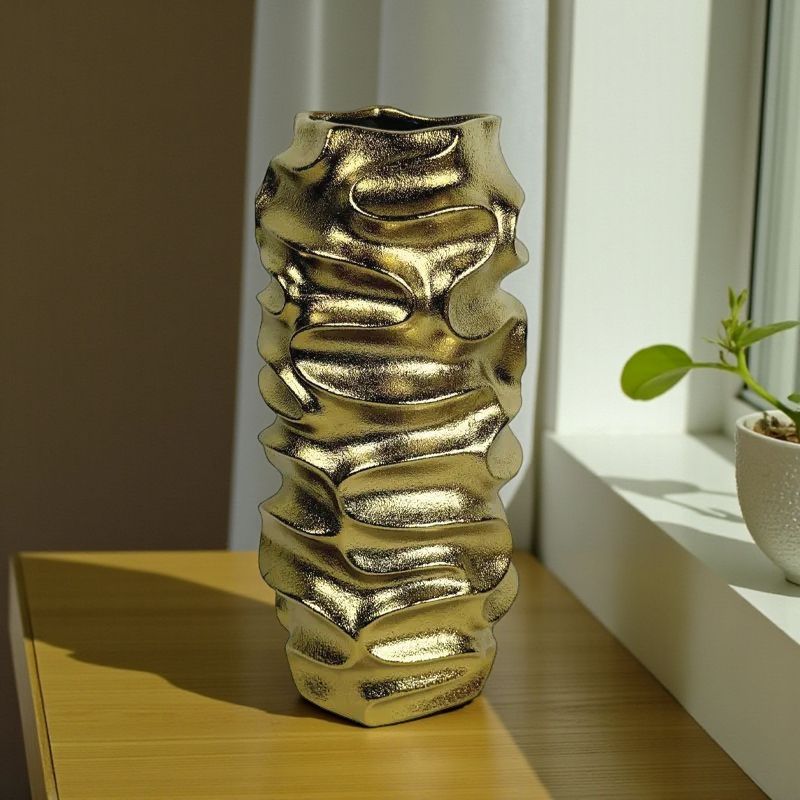 Серията от вази СЛЪНЧЕВИ ЛЪЧИ е попила златното на слънцето и грее в целия си блясък. Изделията са истински шедьоври заради формите и дизайна, който имат. Цветът им е непреходен, защото от дълбока древност, богатството се е свързвало с цвета на златото. Тези вази поставени на правилното място могат да се превърнат в истинско произведение на изкуството, а с правилните цветя в тях ще вдъхнат живот на всеки кът от дома. Също така могат да бъдат използвани за аранжировки със сухи или естествени цветя.Могат да се използват с вода.
