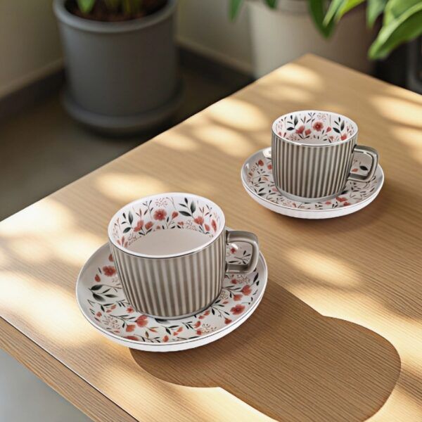 Дизайнът на серия от чаши СЛЪНЧЕВА ГРАДИНА е попил топлината и цветовете от слънцето и ги е съхранил върху повърхността на чашите и чиниите. Тези малки цветчета опасват, като огърлица страните на артикулите и им вдъхват живот, какъвто в природата носи пролетта. Красив и правещ впечатление , този сервиз е начин да се насладите на любимата напитка в хубава компания със стил и усещане за свежест. Комплектът се състои от 2 броя чаши и 2 броя чинии. Чашите са опаковани в подаръчна кутия, което ги прави и подходящи за подарък.