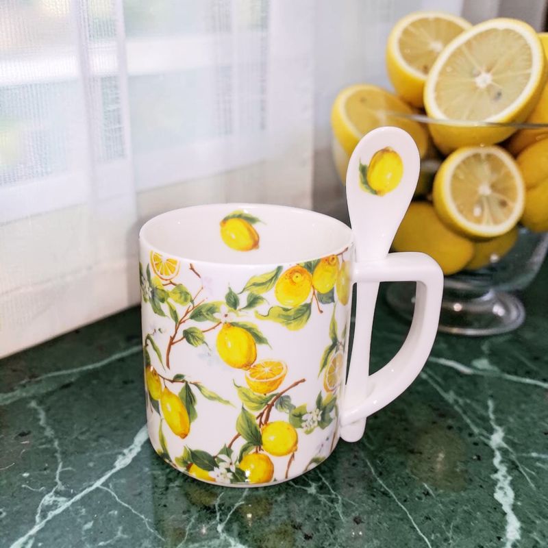 ЛИМОНИ, ЛИМОНАДА, ЛИМОНЧЕЛО - познат трактат и начин да правърнеш киселия плод в любима напитка. Серията от чаши и чинии, която очарова с визия и форми, може да се превърне в част от ритуалите за удоволствие в ежедневието, като използвате артикулите по предназначение. Трапезата е мястото, където се срещат вкус, стил, умения и гостоприемство. Тя може да превърне всяка къща в дом и да накара всеки да почувства уюта и топлината. С тази серия от съдове винаги красотата ще присъства на масата. Чашите са начин да изпиете любимата напитка и да изпитате още по-голямо удоволствие от това. Всеки артикул е опакован в луксозна цветна опаковка с дизайна на чашите и чиниите, което превръща серията в подходящ подарък за всеки ценител на хубавия порцелан. Комплектът се състои от 1 брой чаша и лъжичка.