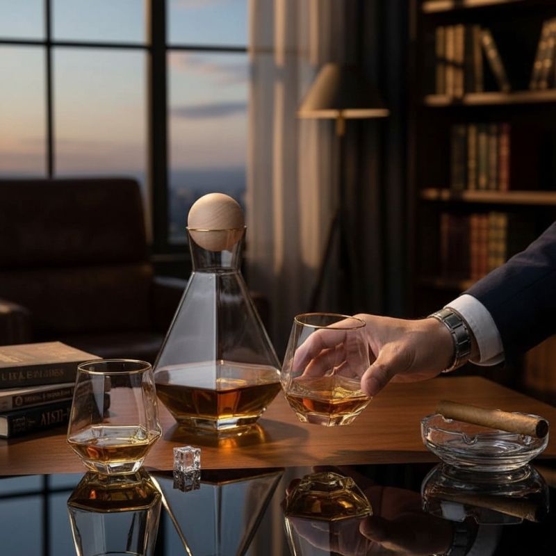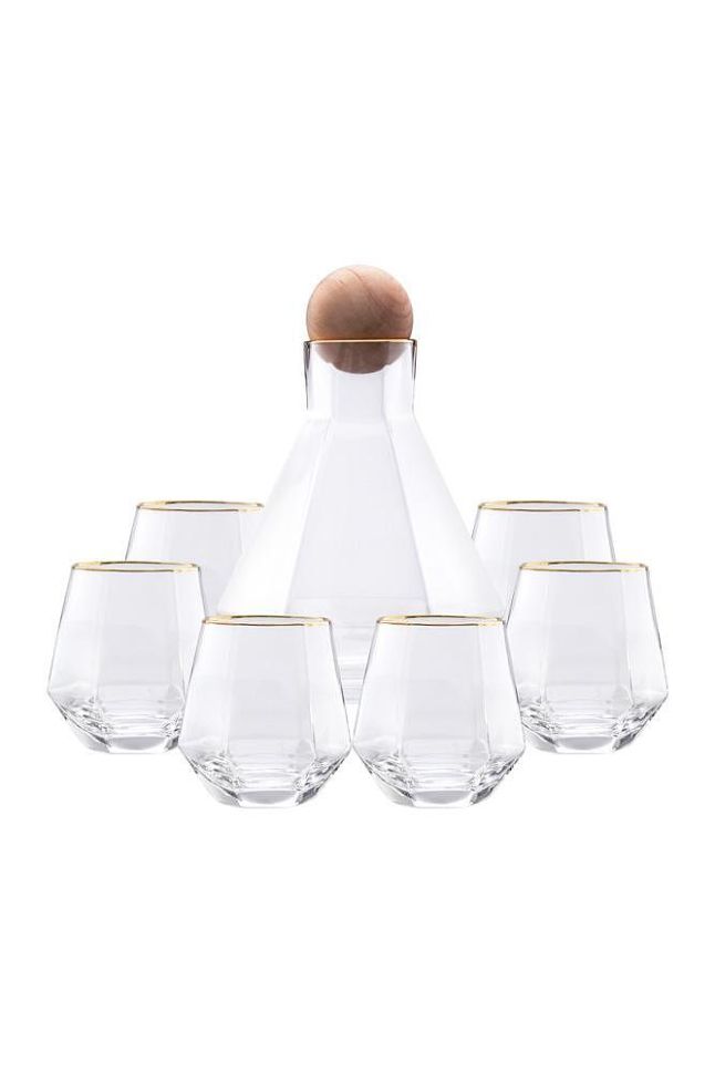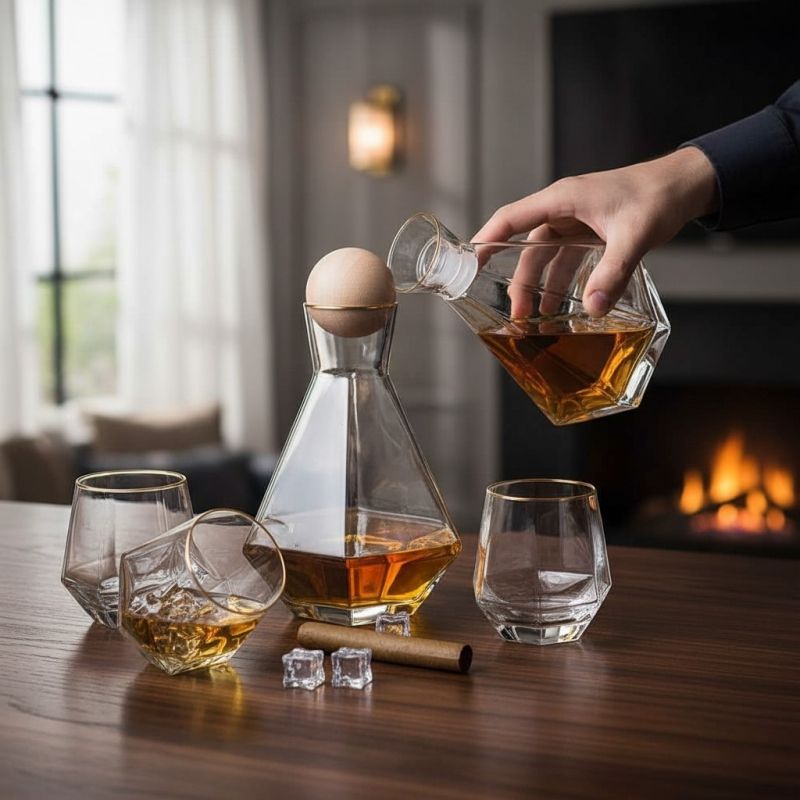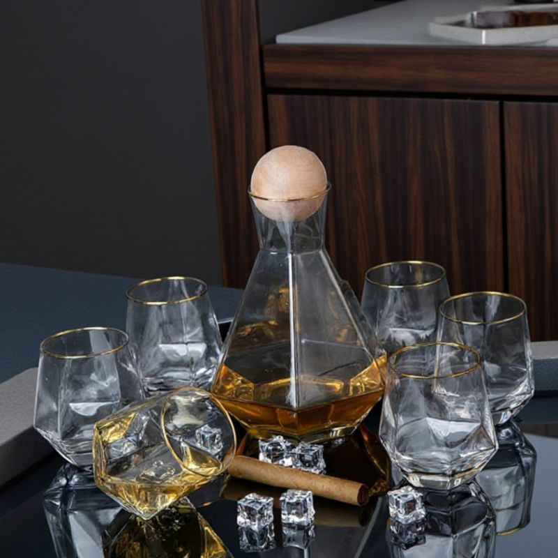 Комплект за уиски от 6 броя чаши и 1 брой гарафа със специална дървена тапа топче. Визия, която ще впечатли всеки с формата и дизайна си. Формата на шестограм и скосеното дъно на чашите и ботилката им позволяват да стоят под наклон, като по този начин се превръщат в модерен и търсен артикул. Чашите могат да бъдат използвани за всякакъв вид алкохол , а ботилката, както за алкохолни така и за безалкохолни напитки. На сайта може да намерите сета в различна външна визия. Артикулът е опакован в цветна подаръчна опаковка.