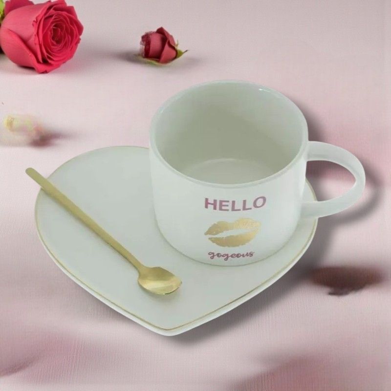 Чашa със златиста метална лъжичка и оригинална чинийка във формата на сърце. Послание,което е написано може да е вашето обяснение в любов към любимия човек. Тези чаши могат да запълнят сутрините и да стартирате денят с любима напитка и положителни емоции. Чашите са самостоятелно опаковани в цветни кутии. Комплектът съдържа две чаши с различни надписи.