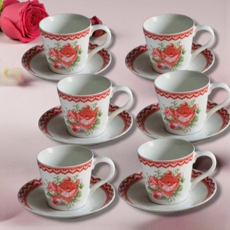 СЕРВИЗ ЗА КАФЕ или ЧАЙ /6чаши + 6чинийки/ - БЪЛГАРСКА БРОДЕРИЯ С РОЗИ