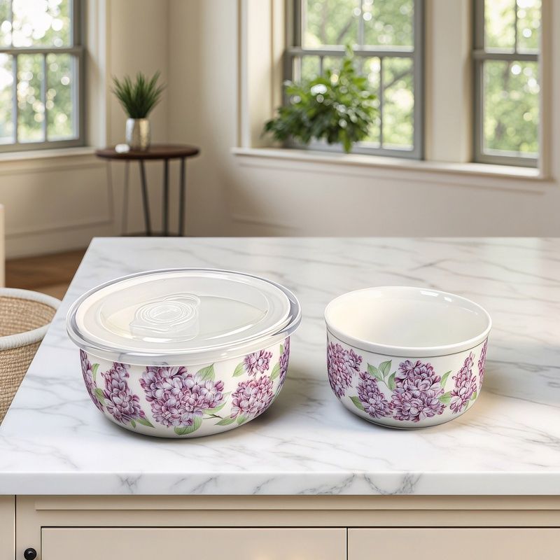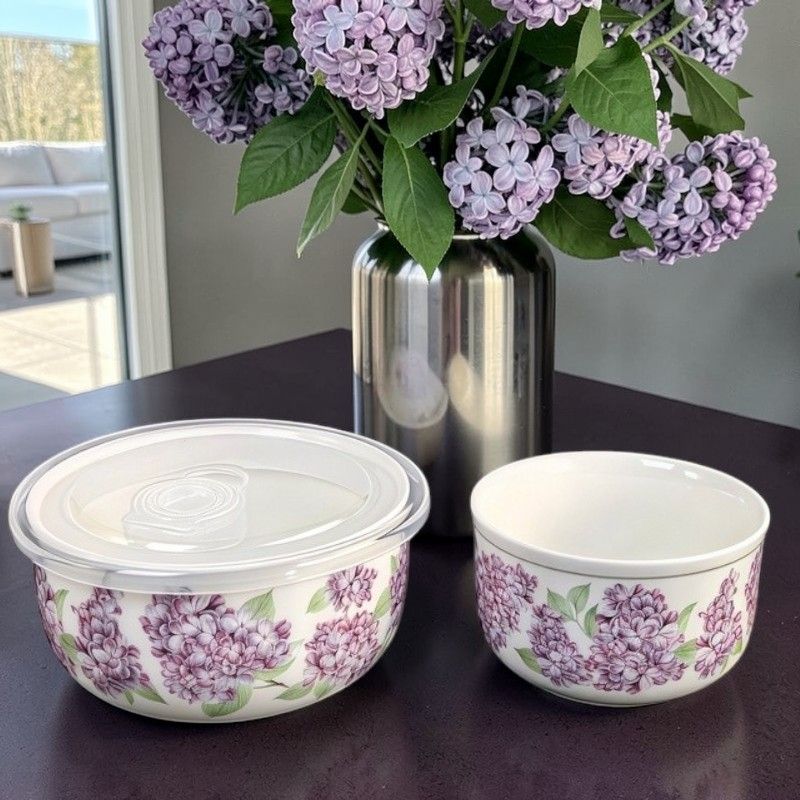 Има цветя, които опианяват, събуждат спомени и рисуват картини във въображението на всеки, който веднъж е усетил силата на техния аромат. Цветовете на люляка, независимо от цвета им имат ухание, което се помни, а кичестите венчелистчета, са като ято съцветия от нежност. Серията ЛЮЛЯКОВИ НОЩИ е съхранила синьо-лилавото в онзи отенък на нощта, която прегръща майчински. Всички артикули са подбрани по начин, който говори за изисканост и стил, които съхраняват ритуали при поднасянето на храна и напитки. Комбинацията от чаши, чинии и посуда може да завърши подредбата на трапезата, така че само и единствено да предизвиква възхищение при вида й. Комплектът се състои от 2 броя различни по размер порцеланови купи, като към всяка има и силиконов вакум капак./p>
