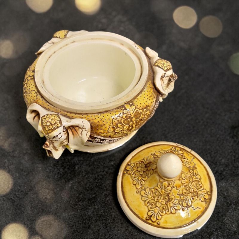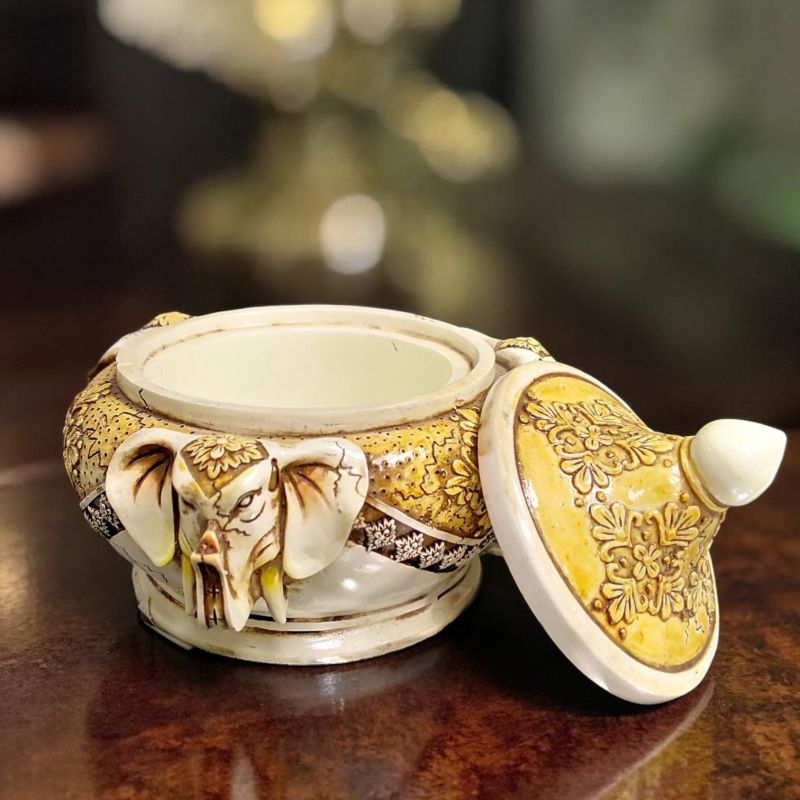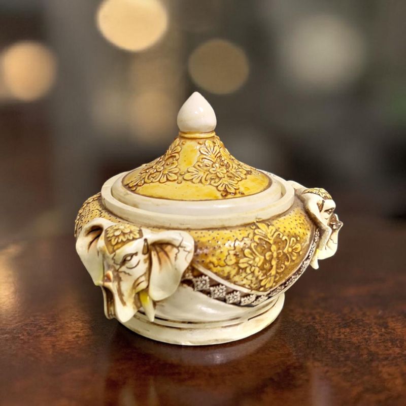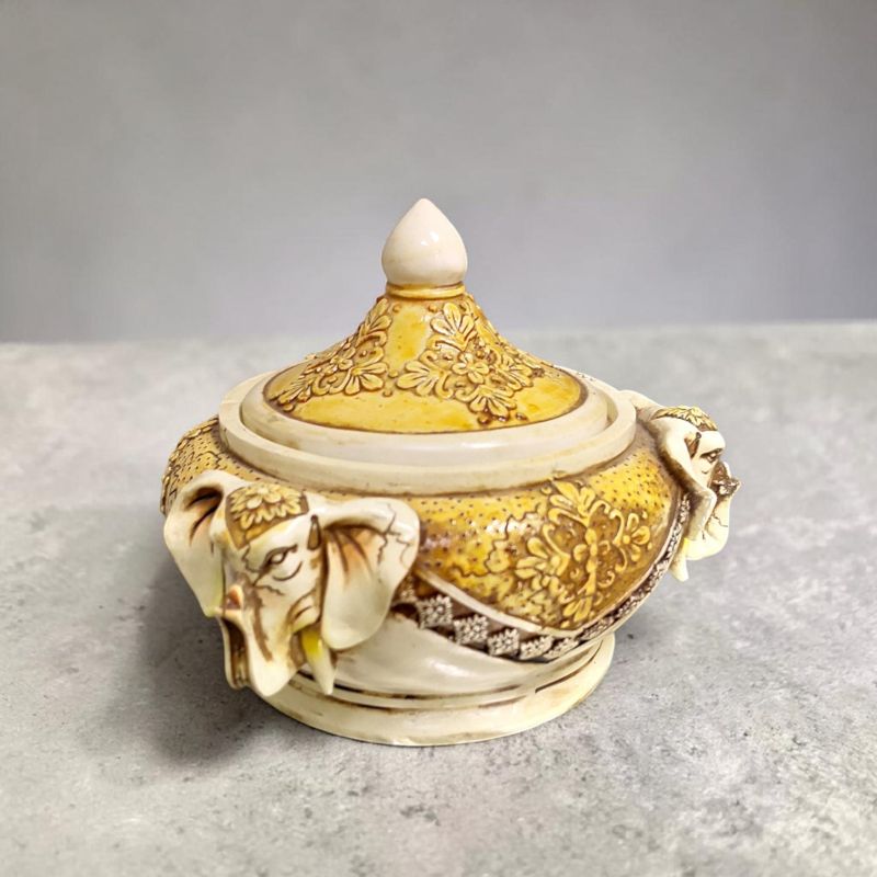 Малка кутия за бижута , игли или дребни предмети в коята винаги ще откриете това, което търсите. Трите слонски глави , поставени по страните на кутията носят повей от източните страни, където това животно е символ на мъдрост, сила и късмет. Размерът и визията на тази кутия са предимство да въведете ред и да откривате дребните неща, които използвате в ежедневието си.
