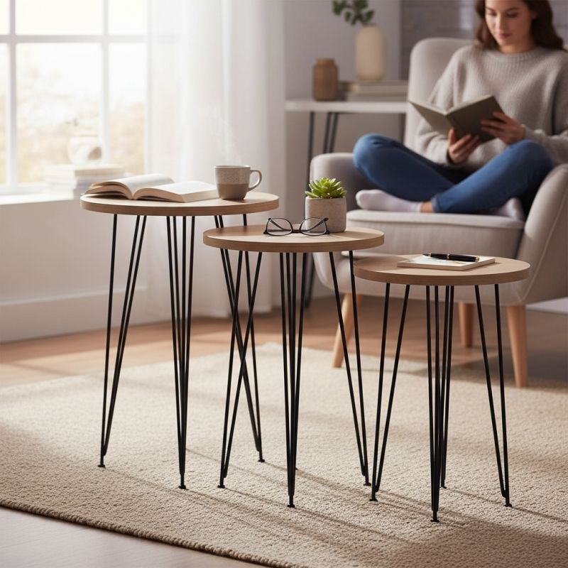 Има мебели, които не натрапват присъствието си, но създават атмосфера и стил, който допълва цялостната визия на помещението. Този комплект от 3 броя, различни по височина маси може да бъде допълнение към интериора и да създаде практичен начин за подреждане или използване в ежедневието. Масите са леки и могат лесно да бъдат премествани и използвани, както по единично, така и като различни комбинации в зависимост от височината, която ви трябва.