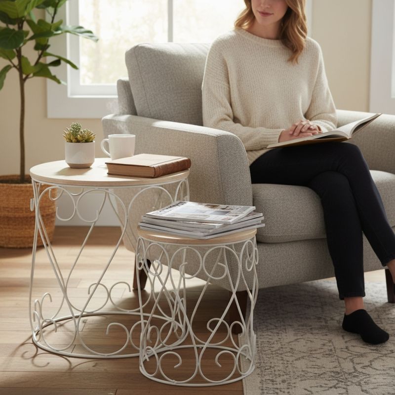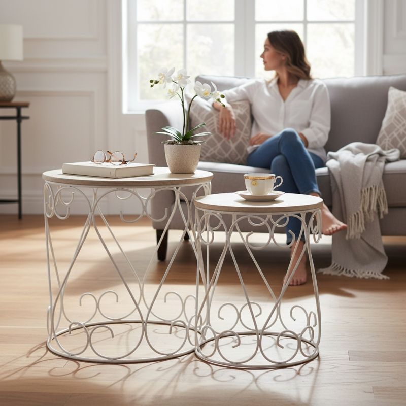 Има мебели, които не натрапват присъствието си, но създават атмосфера и стил, който допълва цялостната визия на помещението. Този комплект от 2 броя, различни по височина маси може да бъде допълнение към интериора и да създаде практичен начин за подреждане или използване в ежедневието. Масите са леки и могат лесно да бъдат премествани и използвани, както по единично, така и като различни комбинации в зависимост от височината, която ви трябва. Металните орнаменти в бял цвят са допълнение, което привлича вниманието.