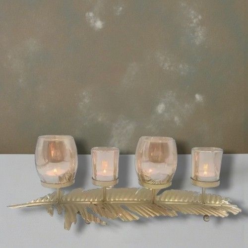 Свещник за четири свещи с основа листо върху което са разположени чашки за свещите. Златистия цвят е класика, която не губи цената от времето. Светлината , която присъства в дома винаги е била символ на топлината и мира.