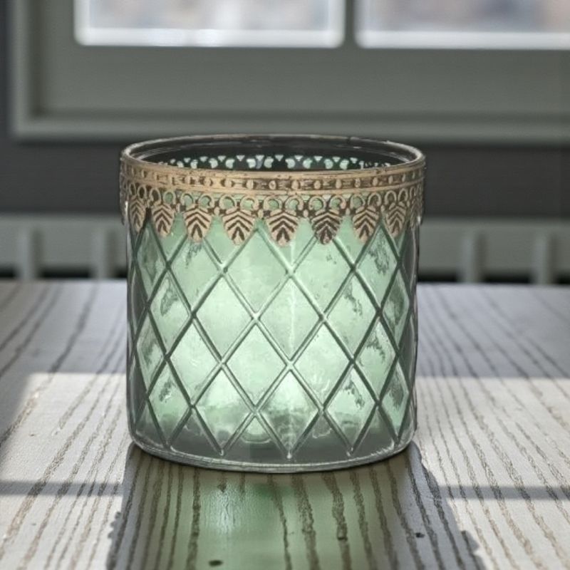 Стъклен тюркоазен свещник с метален обков в златисто Ф9Х8