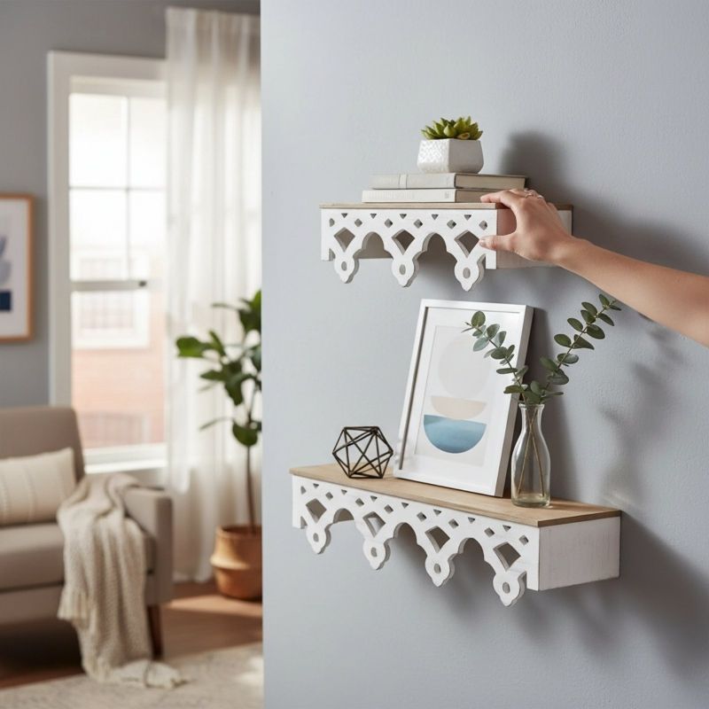 Комплектът от два броя рафтове за стена БЯЛА ОРНАМЕНТИКА е акцент за стената, който може да създаде място за съхранение и подредба на любими предмети. С него може да създадете композиции от различни нива и размери. Винтидж стилът и бели орнаменти придават излъчване, което се помни, а прорязания кант от дървена дантела е като произведение произлязло от ръцете на майстор дърводелец.
